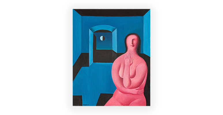 Obraz s ženskou figurou v odstínech růžové, které je ponechána její tělesnost, zobrazuje na první pohled zdánlivě všední motiv